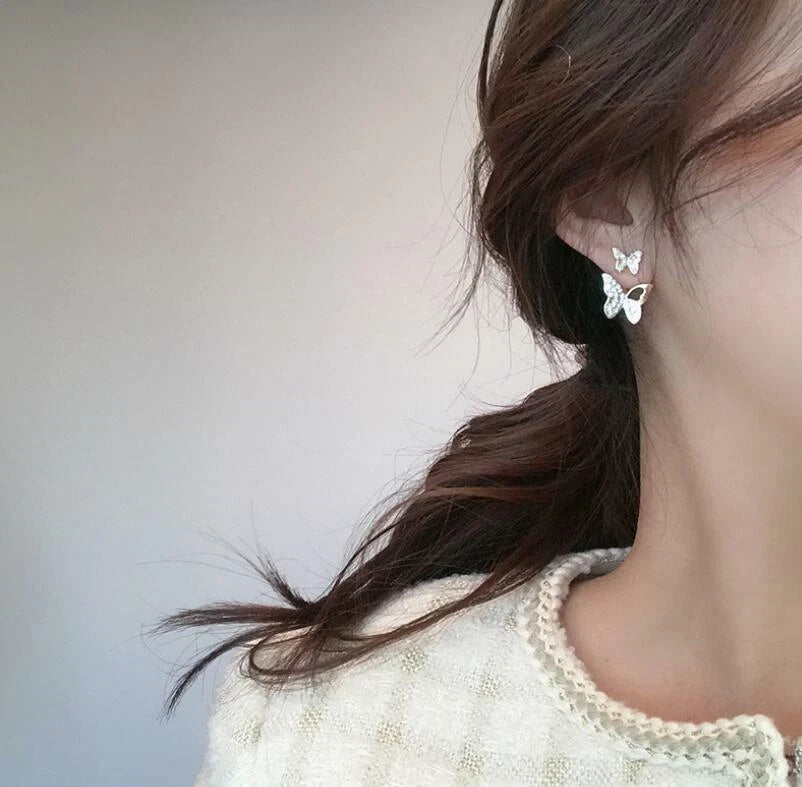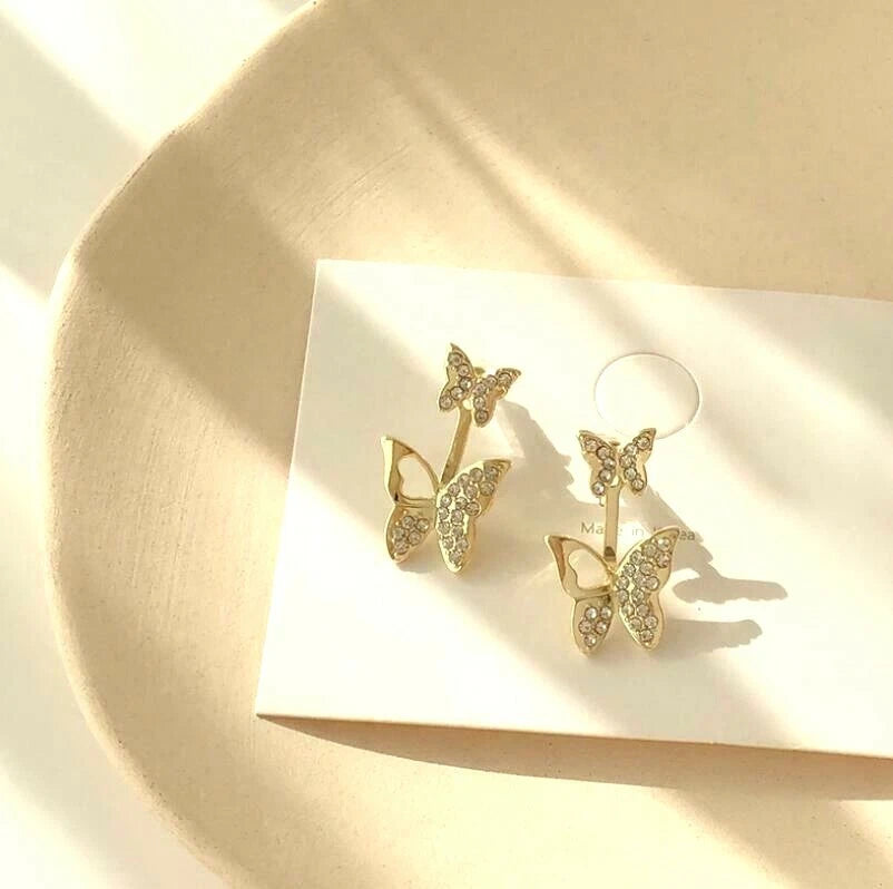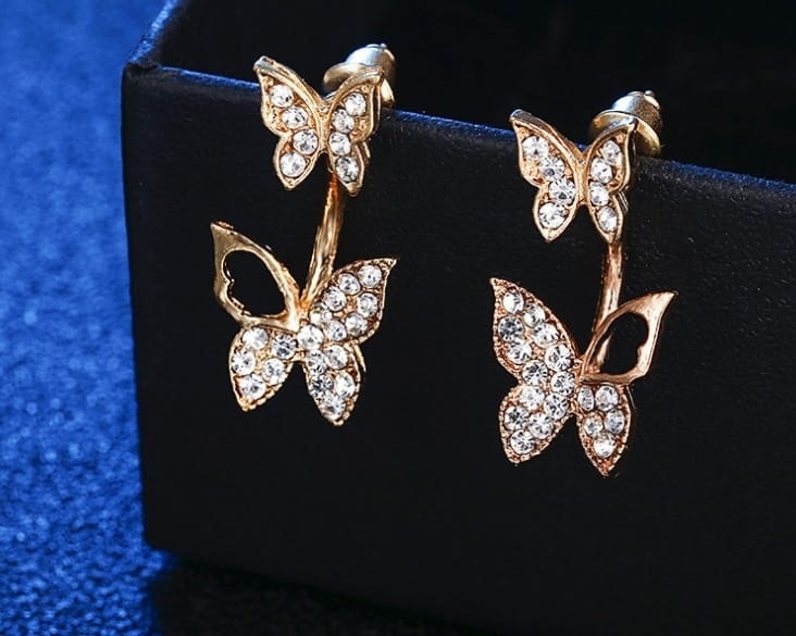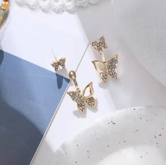 Delicate yet statement-making, the Butterfly Dual-Style Crystal Earrings are a stunning representation of modern elegance. Crafted from a gold-toned alloy, these earrings feature a unique two-part butterfly design — a smaller crystal-studded butterfly sits at the front of the earlobe, while a larger matching butterfly delicately peeks from behind, creating a beautiful layered effect.