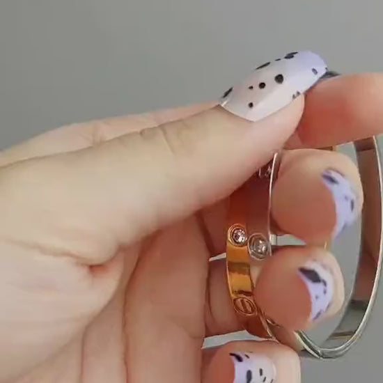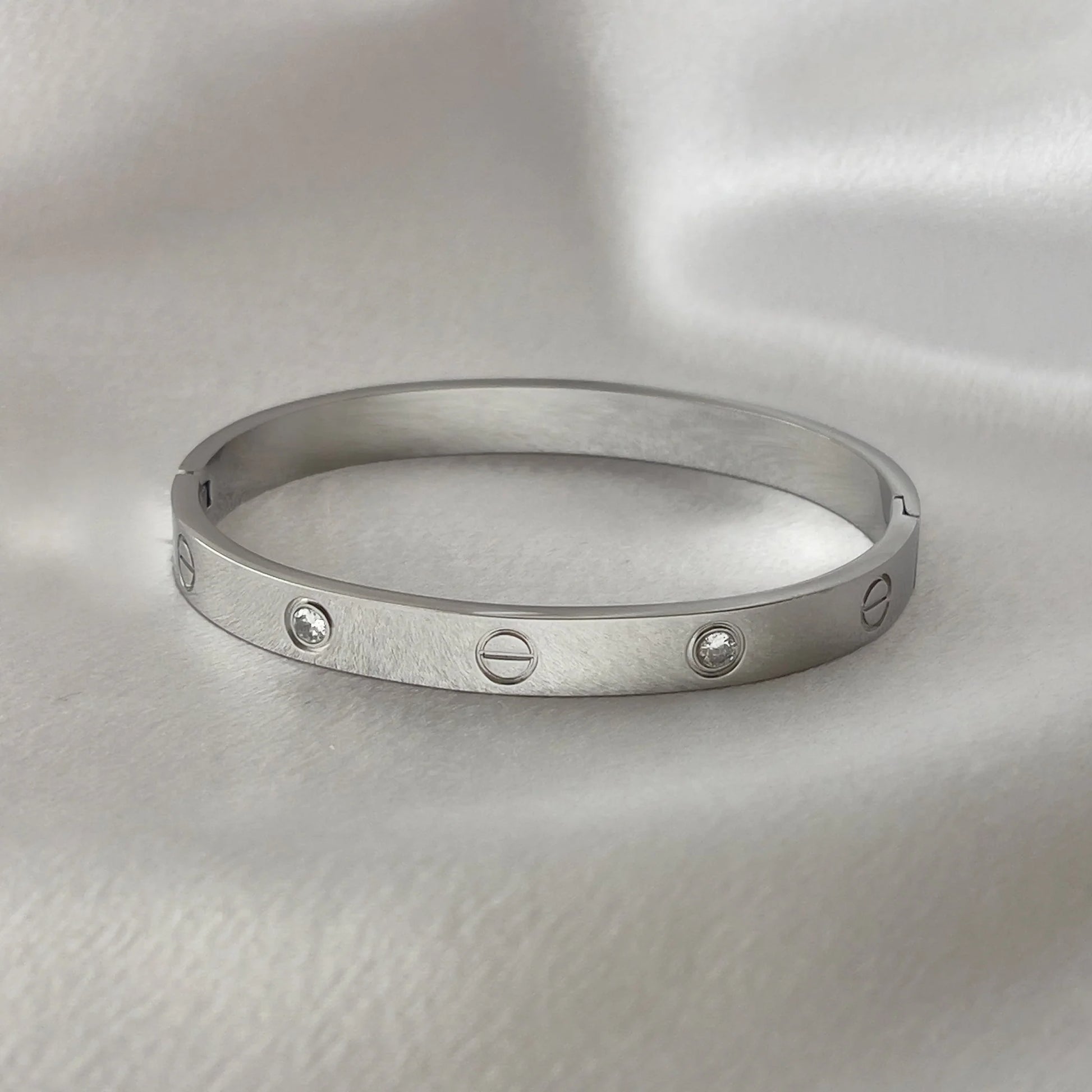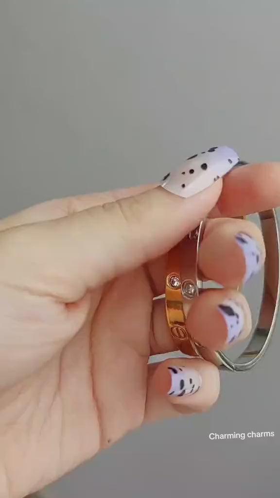 Inspired by the iconic Cartier design, this "Love"-style bracelet embodies elegance and symbolism. Crafted in a sleek oval shape, it features signature screw motifs along the band — a symbol of commitment and timeless affection. Sparkling clear rhinestones are delicately embedded between the screws, adding a touch of glamour while preserving the minimal, unisex appeal.