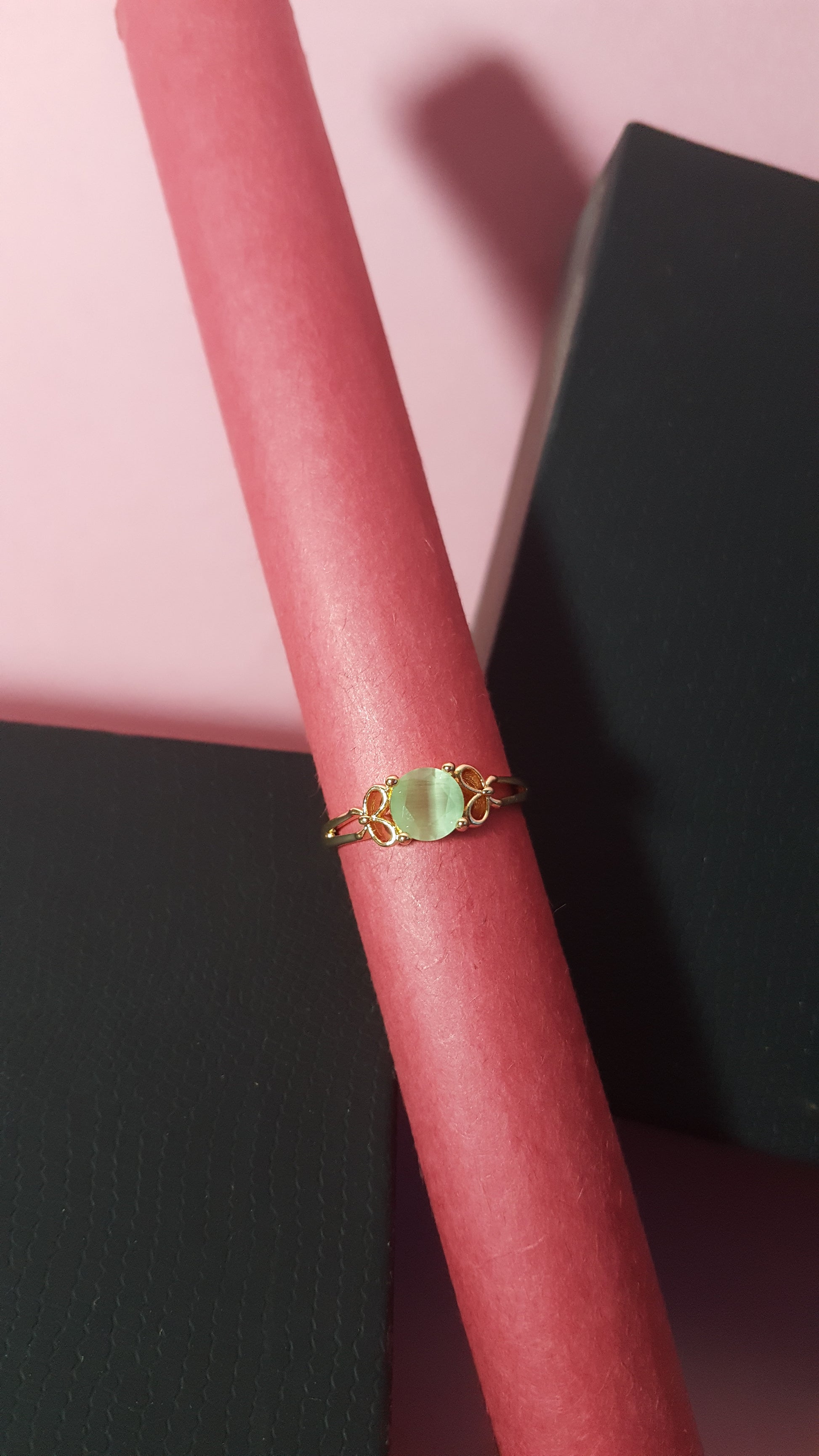 Meet Sage Dome _____ A graceful blend of classic elegance and captivating detail, this ring is designed to leave a lasting impression. The split shank band features delicate bow-like flourishes on either side of the gemstone, giving it a subtle, sculptural charm. The band is finished in a gold-toned polish, adding warmth and sophistication to the piece.