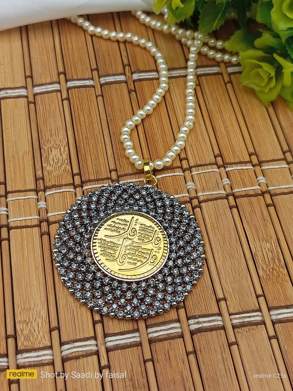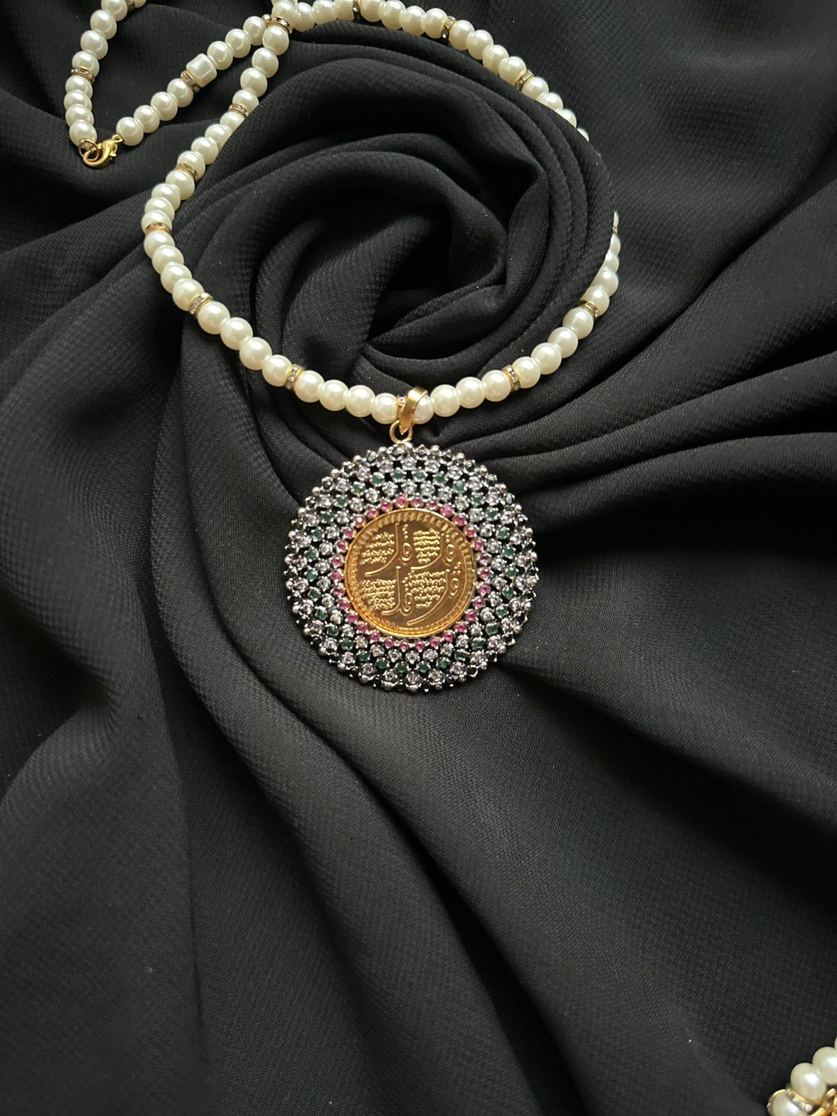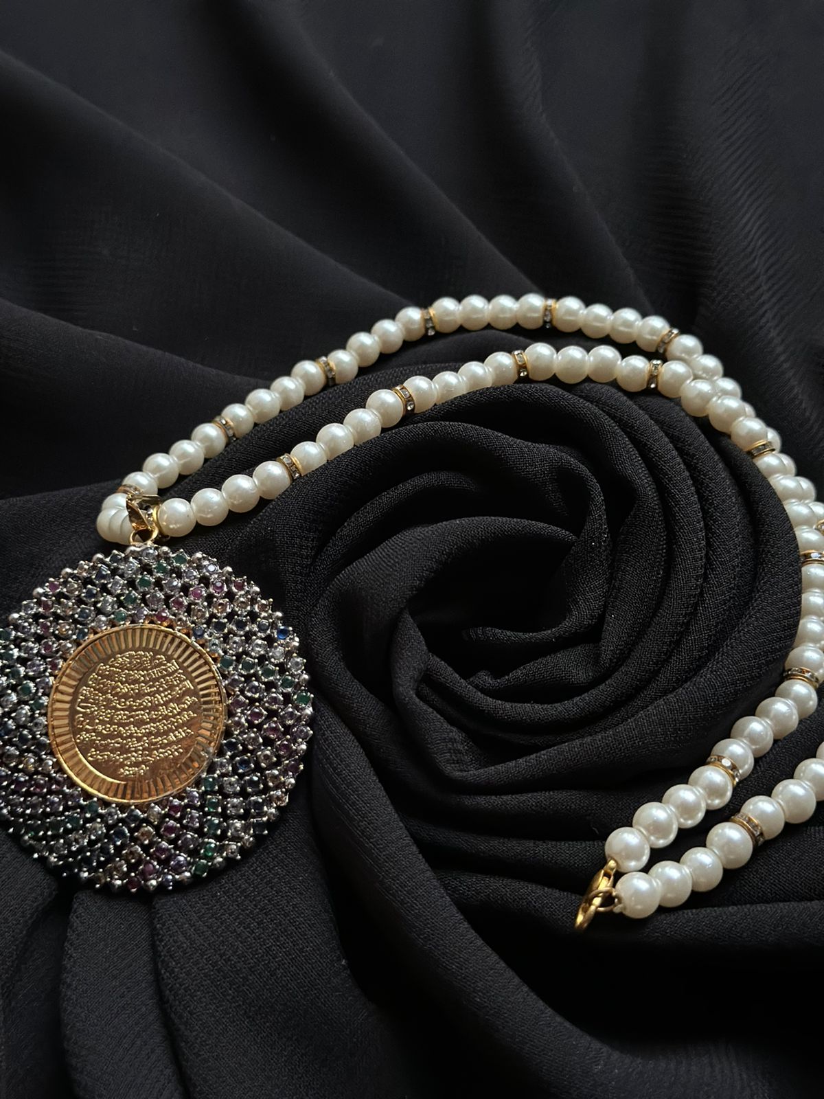 The Four Quls Pendant features a circular, gold-toned medallion engraved with the revered chapters — Al-Kafirun, Al-Ikhlas, Al-Falaq, and An-Nas — encircled by a delicate ring of clear zircon stones. This piece is suspended from a classic pearl mala, offering a graceful contrast to the intricate calligraphy.