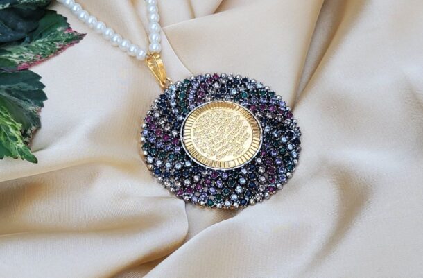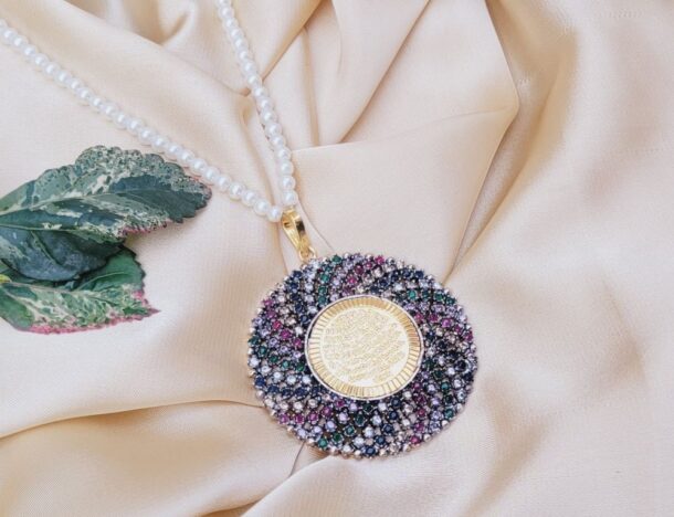 In contrast, the Ayatul Kursi Pendant showcases the verse in beautifully detailed Arabic script, inscribed on a gold-toned disc framed by vibrant concentric rings of gemstones in hues of red, black, and white — symbolizing strength, protection, and purity. It too hangs from a string of white pearl-like beads, combining bold design with timeless elegance.